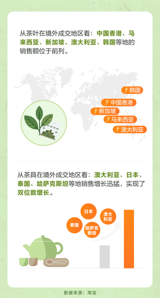 茶周边产品也同样畅销海外。茶具成交中,澳大利亚、日本、泰国、哈萨克斯坦等地销售增长迅猛,实现了双位数增长。在以华人为核心购买群体的影响下,越来越多的外国消费者也通过茶消费,来体验中国文化。