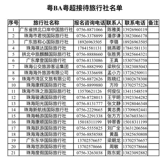 目前,珠海市旅行社行业协会已公布20余家合规接待旅行社及报名咨询渠道,为广大球迷朋友提供规范、优质的一站式接待服务。赛事期间,球迷凭粤BA、粤超赛事门票票根可享受减免团费专属优惠,持续放大“票根经济”促消费效应。