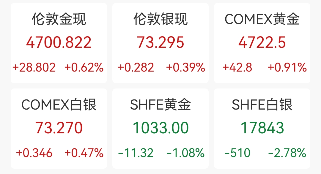 现货黄金向上触及4700美元,日内上涨0.62%。现货白银涨0.39%,报73.295美元/盎司。