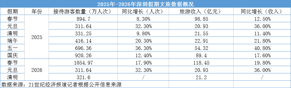 据21世纪经济报道记者梳理,从2025年至今,全国每个假日期间,深圳均实现了客流和销售收入两位数的双增长。
