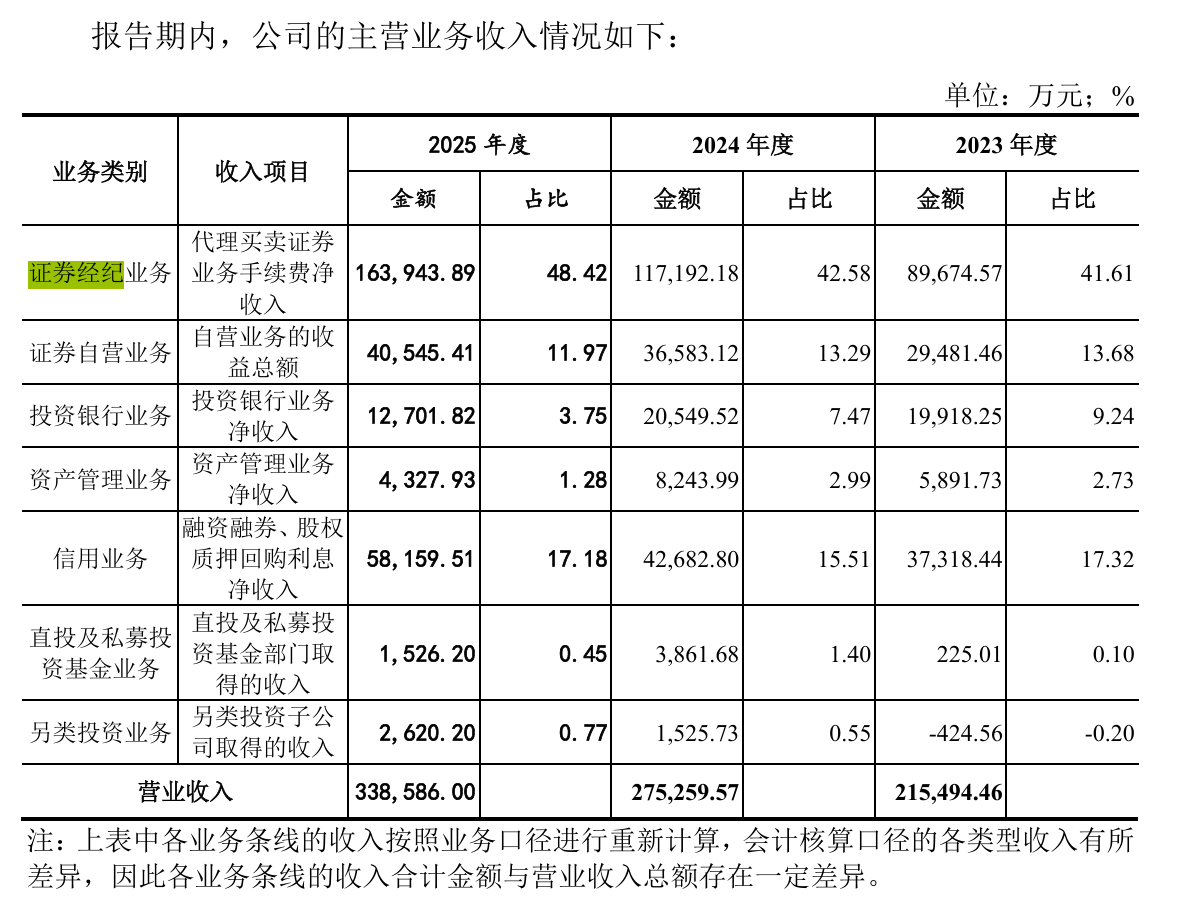 在巩固东莞本地经纪业务优势地位的基础上,东莞证券从2009年开始加快布局广东省其他区域和省外的营业网点。截至2025年末,东莞证券设立了101家证券营业网点(含证券经纪业务分公司),其中东莞市内有30家,广东省其他区域有34家,另外37家分布于广东省外,来自东莞市经纪业务的收入贡献有所下降,但2025年仍占比54.66%。