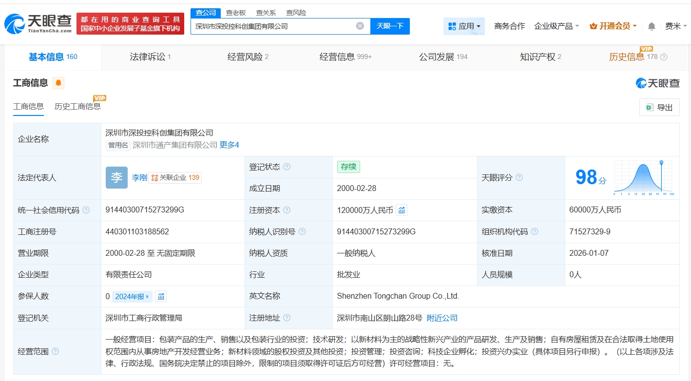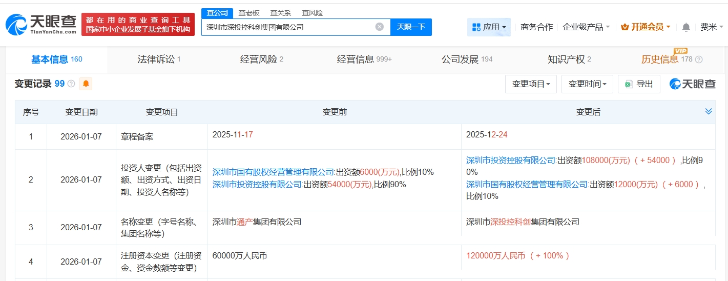 21财经1月13日电,天眼查工商信息显示,近日,深圳市通产集团有限公司发生工商变更,企业名称变更为深圳市深投控科创集团有限公司,同时,注册资本由6亿人民币增至12亿人民币,增幅100%。深圳市深投控科创集团有限公司成立于2000年2月,法定代表人为李刚,经营范围包括包装产品的生产、销售以及包装行业的投资等。股东信息显示,该公司由深圳市投资控股有限公司、深圳市国有股权经营管理有限公司共同持股。