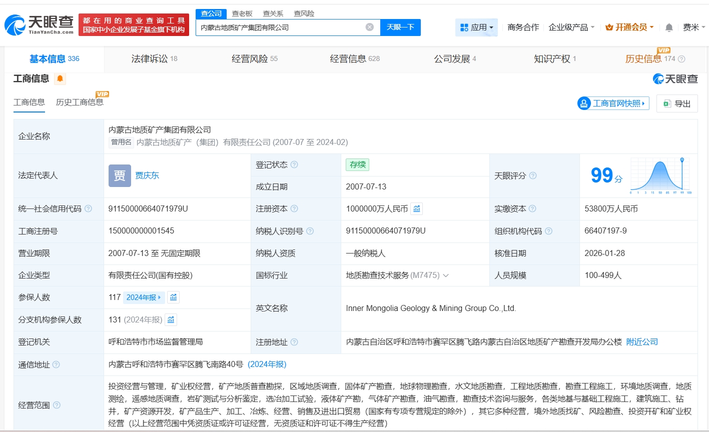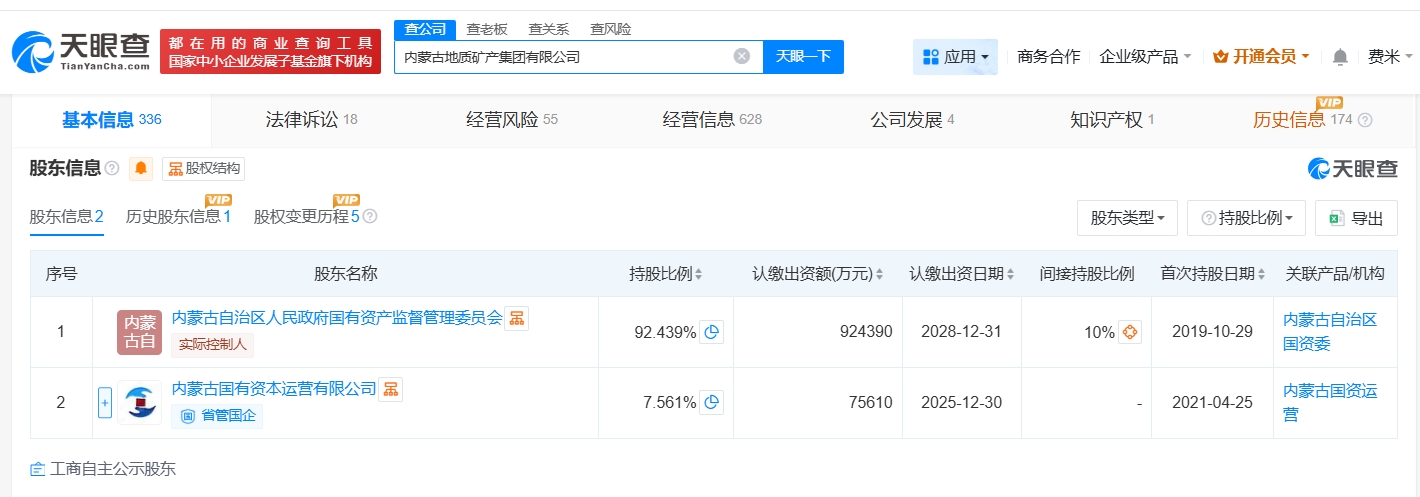 南方财经2月2日电,天眼查App显示,近日,内蒙古地质矿产集团有限公司发生工商变更,注册资本由5.38亿人民币增至100亿人民币,增幅约1759%,同时,多位高管发生变更。该公司成立于2007年7月,法定代表人为贾庆东,经营范围包括投资经营与管理、矿业权经营、矿产地质普查勘探、区域地质调查等,由内蒙古自治区人民政府国有资产监督管理委员会、内蒙古国有资本运营有限公司共同持股。
