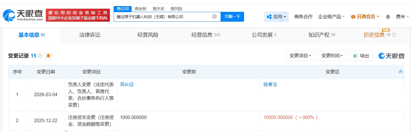 南方财经3月10日电,据媒体报道,近日,魔法原子宣布完成5亿元融资,投资机构包括天空工场创投基金、拓普集团等。天眼查工商信息显示,魔法原子机器人关联公司魔法原子机器人科技(无锡)有限公司成立于2023年12月,经营范围包括智能机器人的研发、工业机器人制造、工业机器人销售等。股东信息显示,该公司由魔法工场(无锡)科技有限公司全资持股。变更记录显示,近期,该公司发生工商变更,创始人吴长征卸任法定代表人,由陈春玉接任。去年12月,该公司注册资本由1000万人民币增至1亿人民币。对外投资信息显示,该公司对外投资8家企业,去年10月以来,该公司成立了魔法工场机器人科技(宜宾)有限公司、魔法原子机器人科技(武汉)有限公司、魔法原子机器人科技(杭州)有限公司。