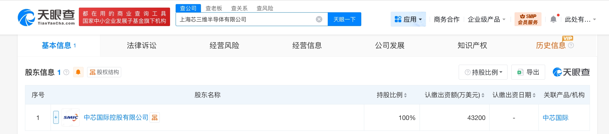 南方财经4月1日电,天眼查工商信息显示,近日,上海芯三维半导体有限公司成立,法定代表人为王永,注册资本4.32亿美元,经营范围包括集成电路制造、集成电路销售、集成电路芯片及产品制造、集成电路芯片及产品销售、货物进出口、技术进出口等。股东信息显示,该公司由中芯国际控股有限公司全资持股。