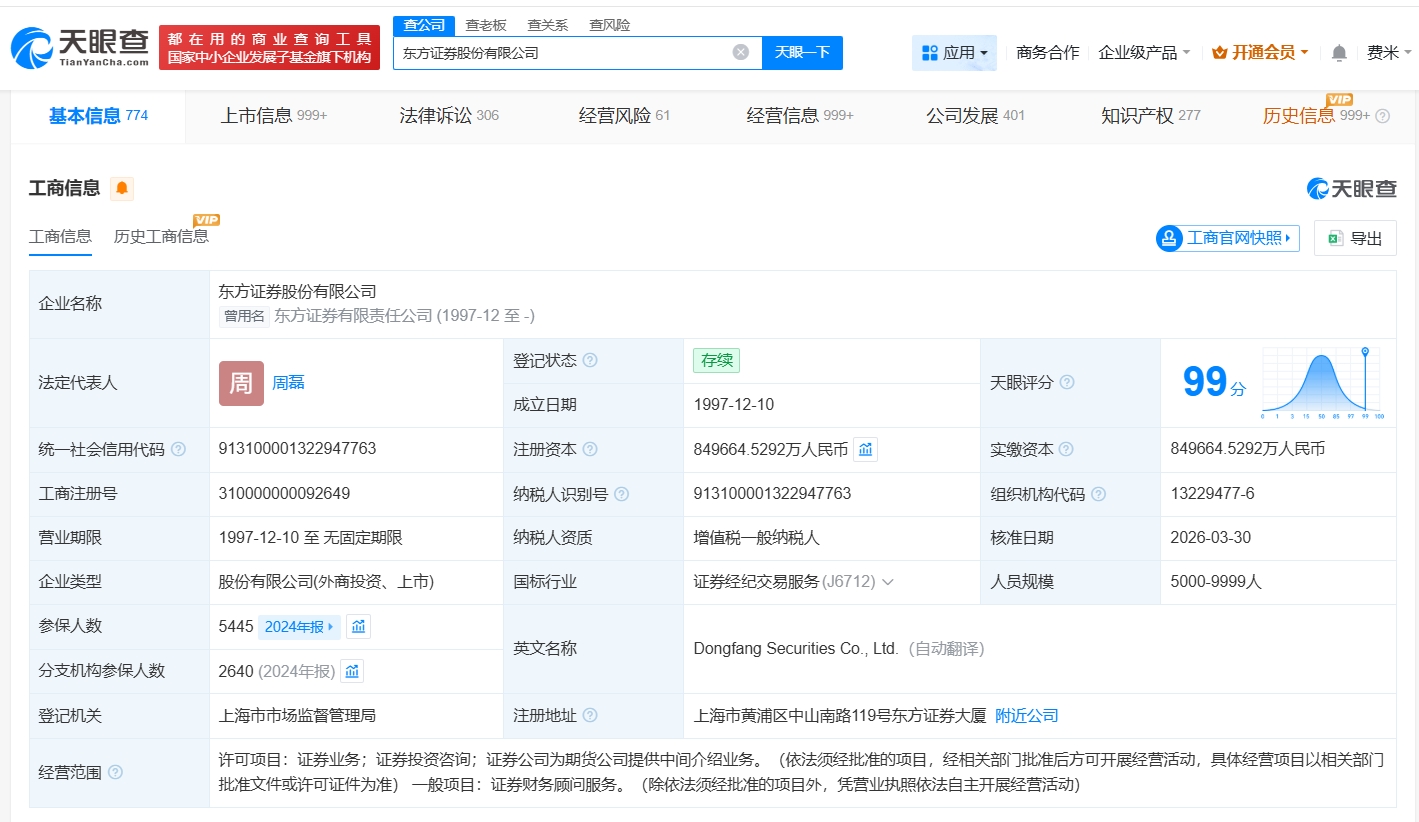 南方财经4月1日电,天眼查App显示,近日,东方证券(600958)发生工商变更,龚德雄卸任法定代表人、董事长,由周磊接任。东方证券股份有限公司成立于1997年12月,注册资本约84.97亿人民币,经营范围包括证券业务、证券投资咨询、证券公司为期货公司提供中间介绍业务等,由申能(集团)有限公司、香港中央结算(代理人)有限公司、上海海烟投资管理有限公司等共同持股。据媒体报道,此前,东方证券发布公告称,周磊被选举为公司董事长。
