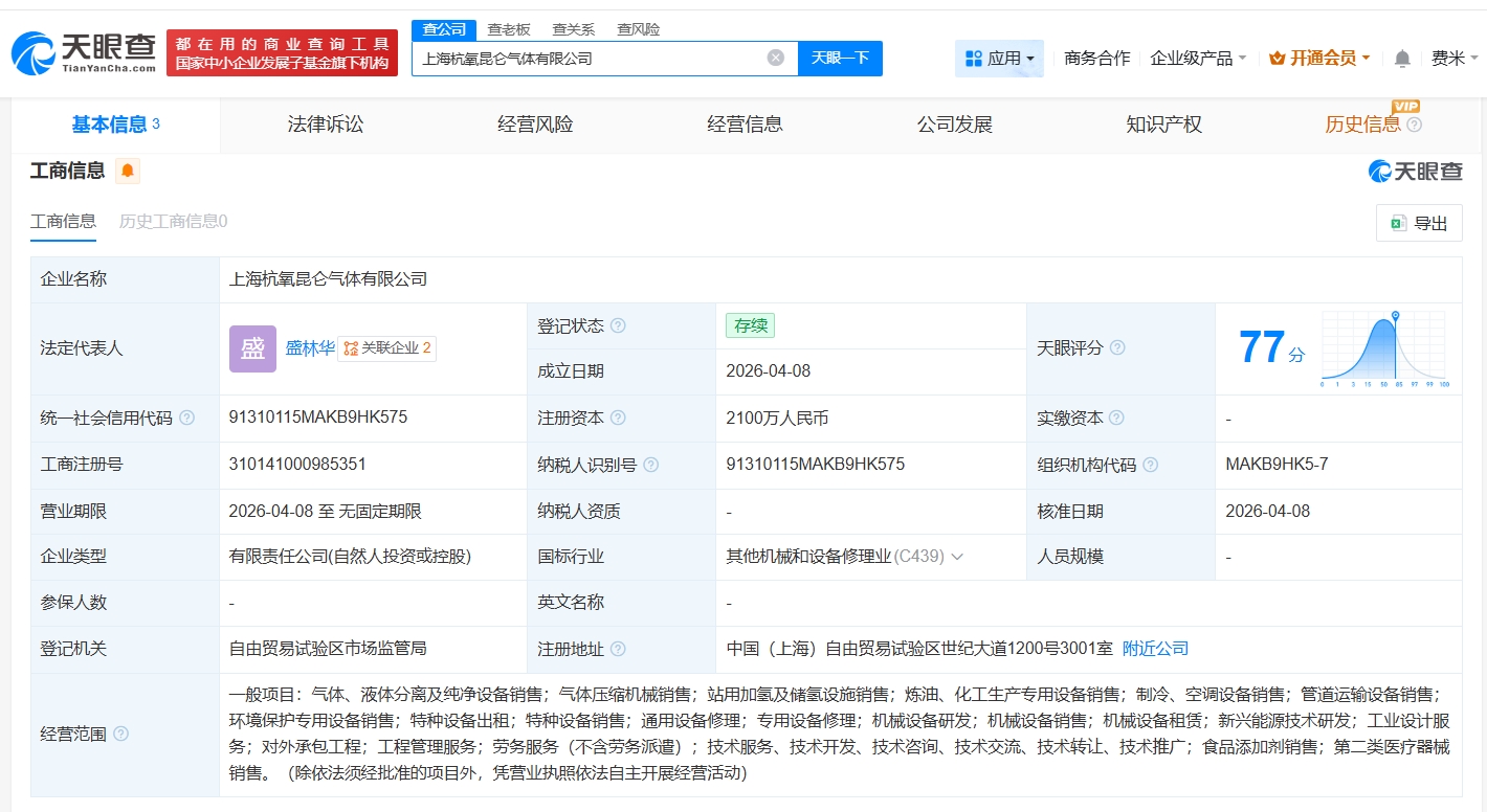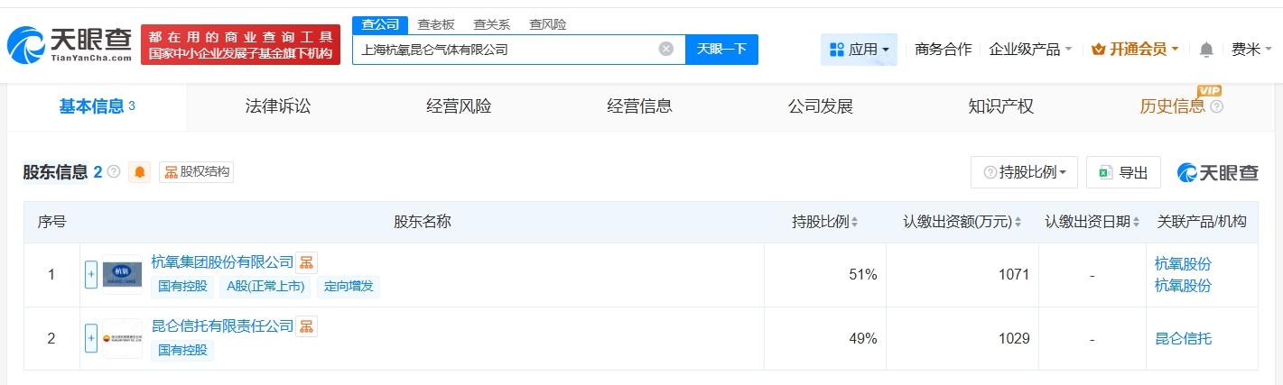 南方财经4月9日电,天眼查工商信息显示,近日,上海杭氧昆仑气体有限公司成立,法定代表人为盛林华,注册资本2100万人民币,经营范围包括气体、液体分离及纯净设备销售,气体压缩机械销售,站用加氢及储氢设施销售等。股东信息显示,该公司由杭氧股份(002430)、昆仑信托有限责任公司共同持股。