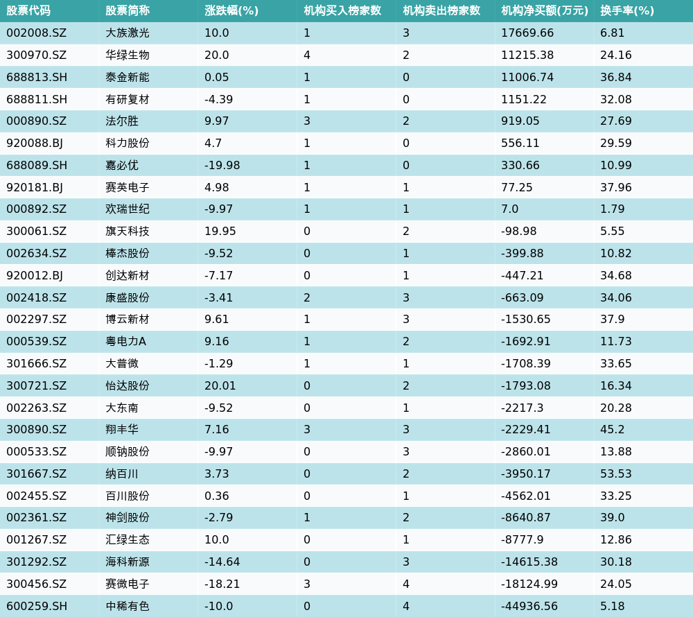 南财智讯4月23日电,盘后数据显示,因当日异动登上龙虎榜的个股中,27只沪深A股龙虎榜出现了机构的身影,机构合计净卖出76315.72万元,具体来看,机构净买入9只个股,净卖出18只个股。其中,机构净买入前三分别为大族激光(002008.SZ)、华绿生物(300970.SZ)与泰金新能(688813.SH),详情见下图:机构净卖出的个股中,前三分别为中稀有色(600259.SH)、赛微电子(300456.SZ)与海科新源(301292.SZ)。